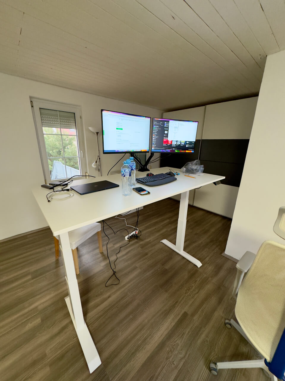 Montaż stołu zajął około pół dnia (około 6-8 godzin), od rozpakowania go, przez montaż nóg, wymyślenie uchwytu na kable, wycentrowanie nóg na blacie z dokładnością do kilku dziesiątych milimetra (nie chcę, aby stół był krzywy), aż po przymocowanie wszystkiego do blatu za pomocą śrubokręta, po ustawienie, wyważenie stołu i przetestowanie go. W końcu wszystko zadziałało za pierwszym razem. Stół pamięta nawet o ustawieniu wszystkiego po odłączeniu od zasilania - pralki i zmywarki mogą być inspiracją! :-)