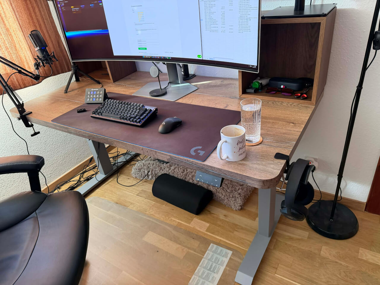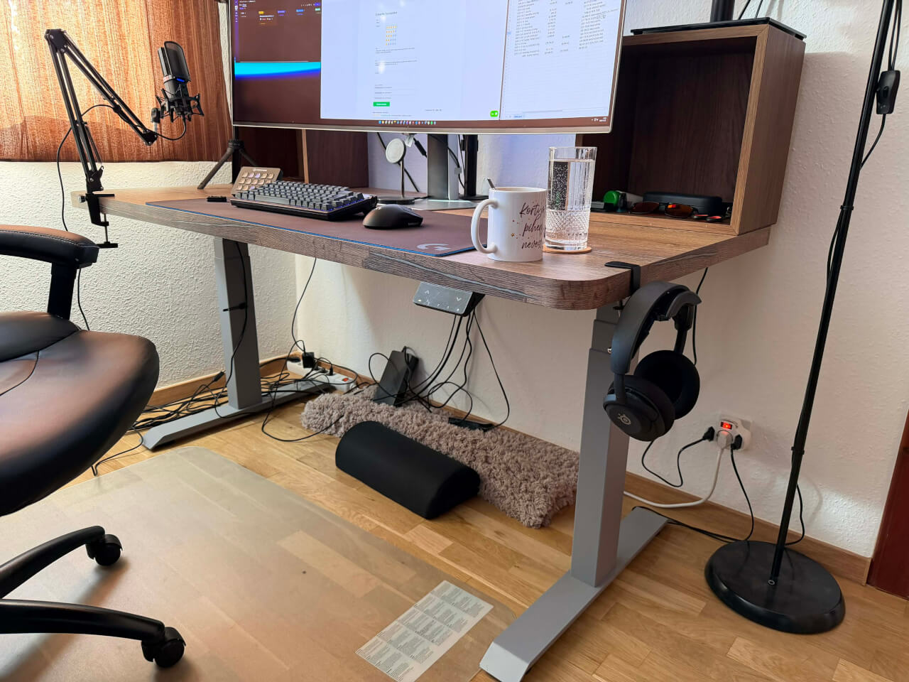 Montaż stołu zajął około pół dnia (około 6-8 godzin), od rozpakowania go, przez montaż nóg, wymyślenie uchwytu na kable, wycentrowanie nóg na blacie z dokładnością do kilku dziesiątych milimetra (nie chcę, aby stół był krzywy), aż po przymocowanie wszystkiego do blatu za pomocą śrubokręta, po ustawienie, wyważenie stołu i przetestowanie go. W końcu wszystko zadziałało za pierwszym razem. Stół pamięta nawet o ustawieniu wszystkiego po odłączeniu od zasilania - pralki i zmywarki mogą być inspiracją! :-)