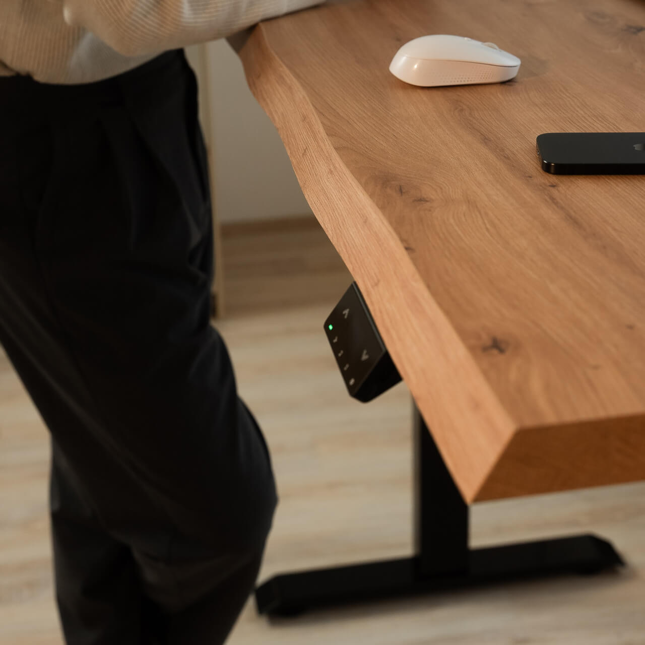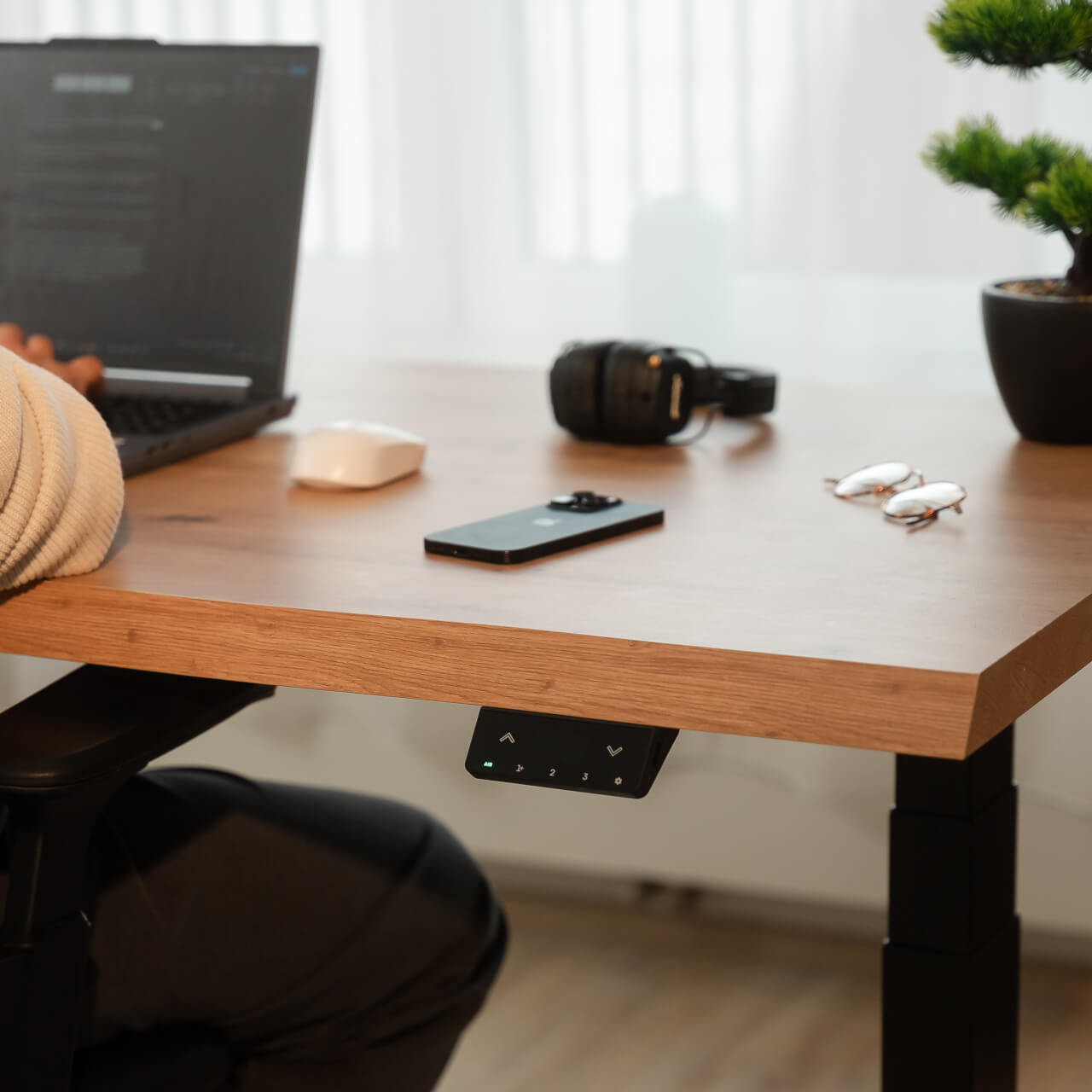 Nasze blaty nie mają wstępnie wywierconych otworów. Dzięki temu możesz samodzielnie dobrać rozstaw nóg oraz umiejscowienie kontrolera zgodnie ze swoimi preferencjami, potrzebami i wymaganiami dotyczącymi instalacji i sterowania.