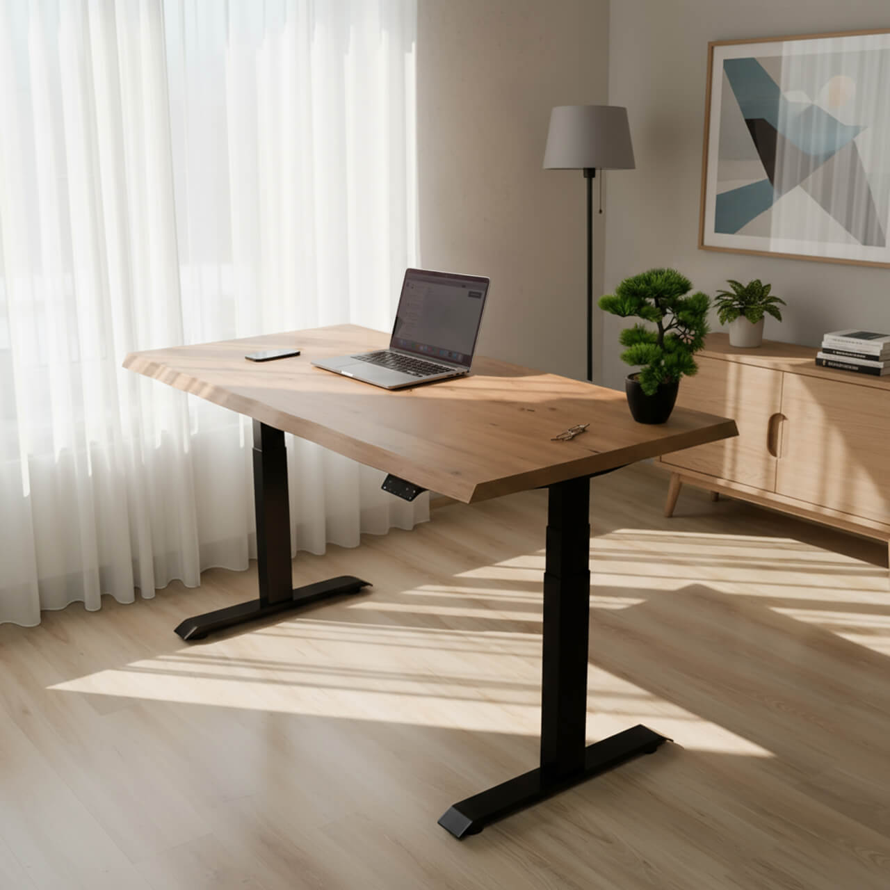 Biurko nigdzie się nie chwieje, blat zachowuje swój kształt nawet w najwyższej pozycji. Możesz położyć do 150 kg na jednej stronie biurka, a on nadal będzie prosty. Nie musisz się więc martwić, że będziesz latać gdzieś w chmurach niczym flaga na maszcie.