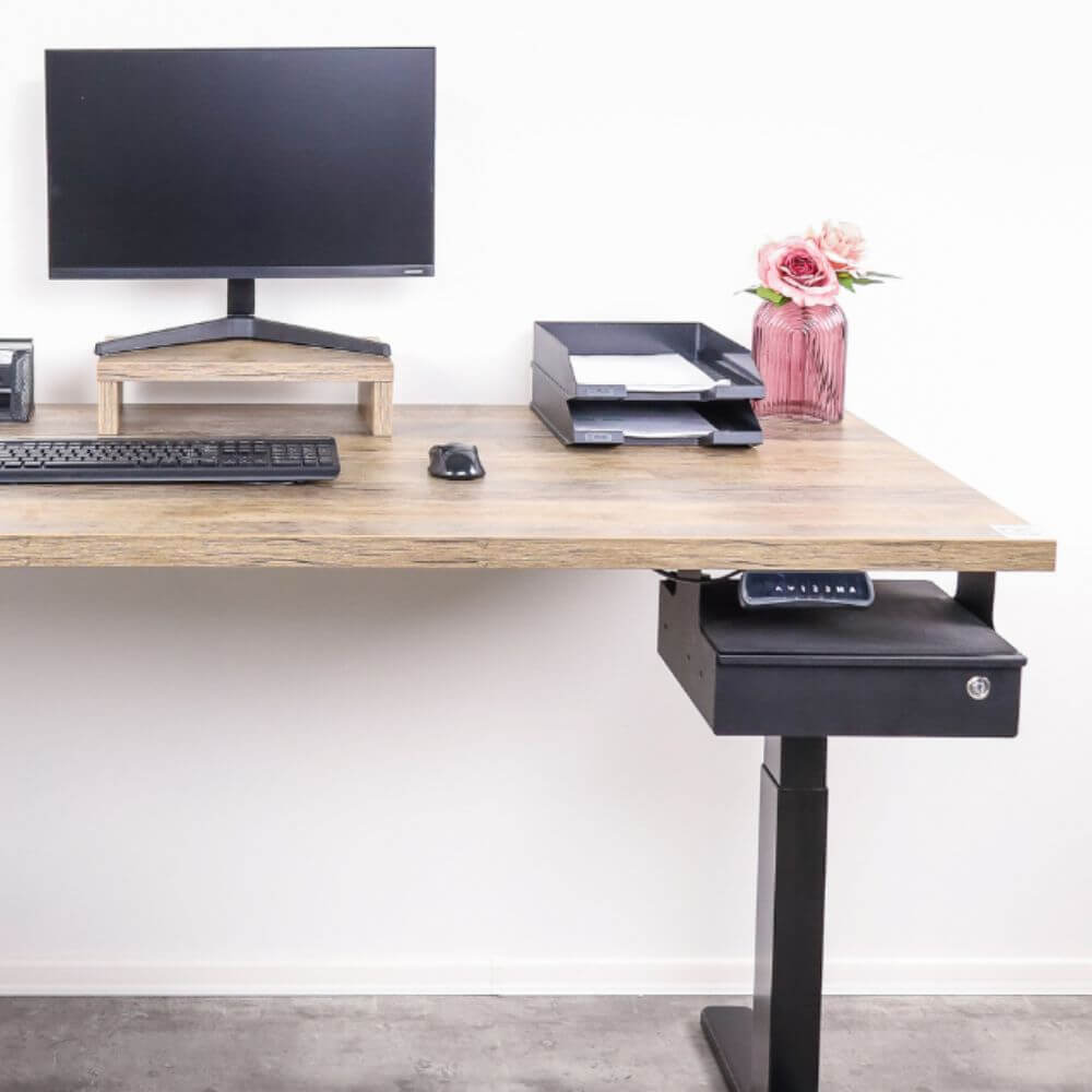 Dzięki swoim wymiarom 342 × 193 × 322 mm i kompaktowemu designowi tę szufladę można łatwo zamontować pod biurkiem z regulowaną wysokością, co pozwala na efektywne wykorzystanie przestrzeni w miejscu pracy.