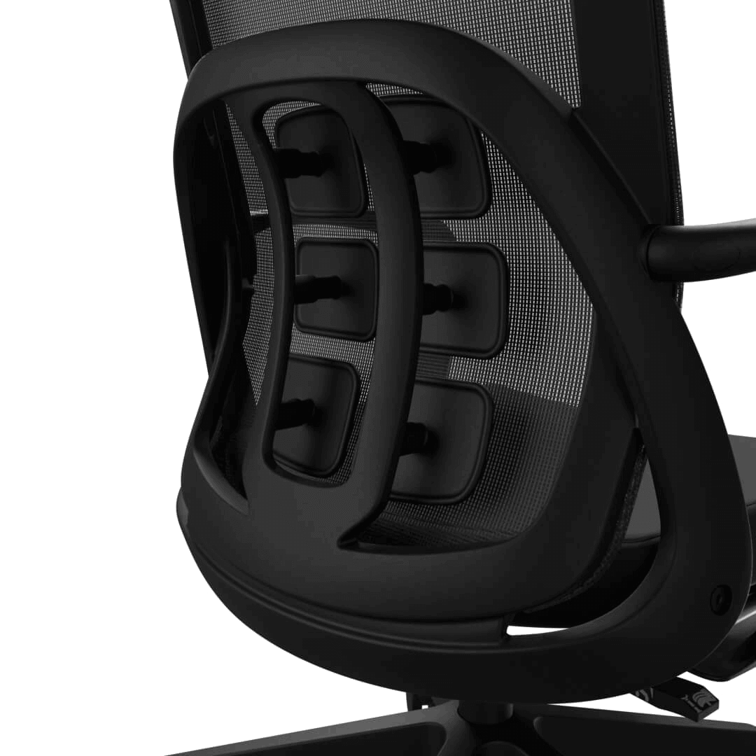 Tylna część oparcia krzesła jest wyposażona w profilowane elementy, które zapewniają ukierunkowane wsparcie kluczowych obszarów pleców. Dzięki temu nacisk jest równomiernie rozłożony, co pozwala na optymalne podparcie odcinka lędźwiowego i górnej części pleców, wspierając prawidłową postawę ciała i redukując zmęczenie podczas długiego siedzenia.